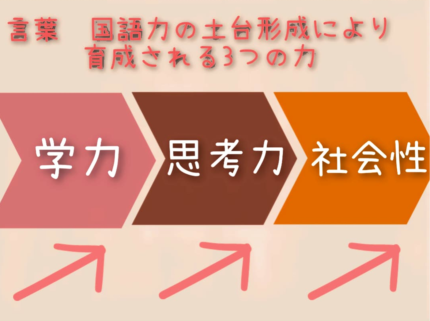 乳幼児期や学童期は、様々な言葉を覚え、言葉の内容を理解し、自分の想いを言葉で表現するための力を身につける、非常に重要な時期となります。よって、国語力は、乳幼児期、学童期までに、しっかりと基盤を整えておかなければなりません。この時期に語彙力や表現力など、国語力の土台形成をしっかりと行うことは、今後の様々な教科学習において、学問への理解を深めることにつながります。なぜならば、国語以外の科目である算数、理科、社会においても、教師の「言葉」を聞き、本などの文章を読み、学問の内容を理解して学んでいくからです。特に中学生以降になると、読解力を求められる文章題が多く出題されるようになってきます。また、言葉や国語力の土台形成は、学習面だけでなく、子ども達の社会生活においても、非常に大切です。周囲の子ども達の言葉を聞き、相手の気持ちを考え、自分の想いを伝えるなど、「言葉」は、コミュニケーションを生み出す、とても重要な役割を持っています。しかし、現在の子ども達を、取り巻く環境はどうでしょうか。核家族化、または動画、アプリ、オンラインゲームを楽しむ時間が多くなり、保護者をはじめ、人と対話する機会が少なくなっています。特に早い時期から保育園などに通うお子様の場合は、大人の言葉に触れる機会が少なくなりがちです。そのため、大人との会話を通して言葉を学んでいくのではなく、同年代の子どもたちとの会話を通して、言葉を覚えていくことが多くなっていきます。そのような背景の中で、あえて大人が子どもと対面し、乳幼児期や学童期に、たくさんの言葉に触れる機会を用意し、言葉を表現力豊かに育んでいくことは、学習面だけでなく、コミュニケーションの側面からみても、大変重要であると考えています。